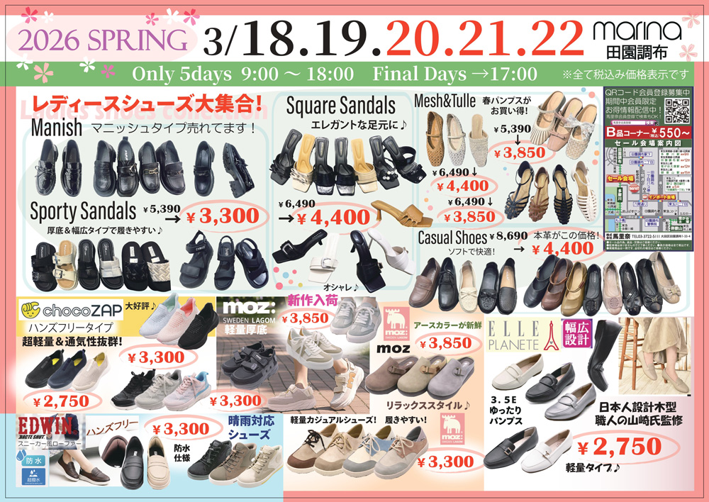 これからの春シーズンに最適なスニーカー、パンプス、レインシューズ、ブランドシューズ各種などをお買い得価格にてセール販売いたします。みなさまのお越しをお待ちしております。